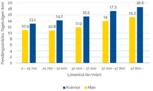 Figur. Män pendlar längre än kvinnor och högavlönade pendlar längre än lågavlönade. Källa: Medlingsinstitutet.