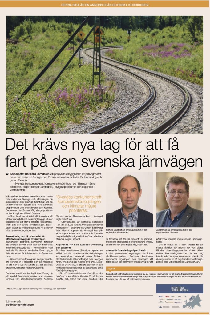 Botniska korridoren bidrar idag till Dagens Industris bilaga med tema infrastruktur. Där lyfter vi att samarbetet Botniska korridoren vill se…
