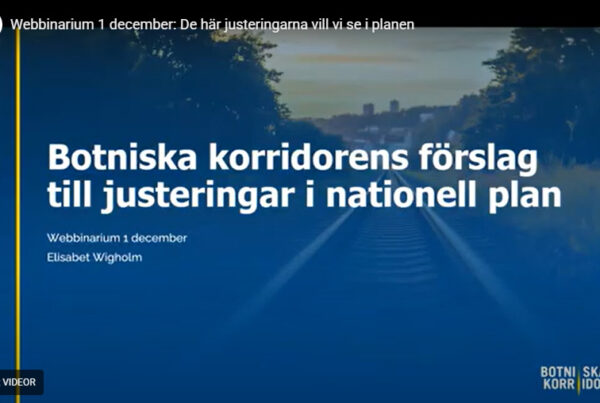 Under ett välbesökt webbinarium om den nationella planen 1 december diskuterade vi vårt yttrande tillsammans med ledamöter från sju av riksdagspartierna. I vår presentation tryckte vi på vikten av att se helheten och bygga ut längre stråk, att utgå från faktiska behov och att bygga kostnadseffektivt. Vi diskuterade konsekvenserna av bristen på infrastruktur och därmed omledningsalternativ i vår geografi, industrins- och Försvarsmaktens behov och att det inte finns tid att vänta på viktiga satsningar till nästa planperiod.